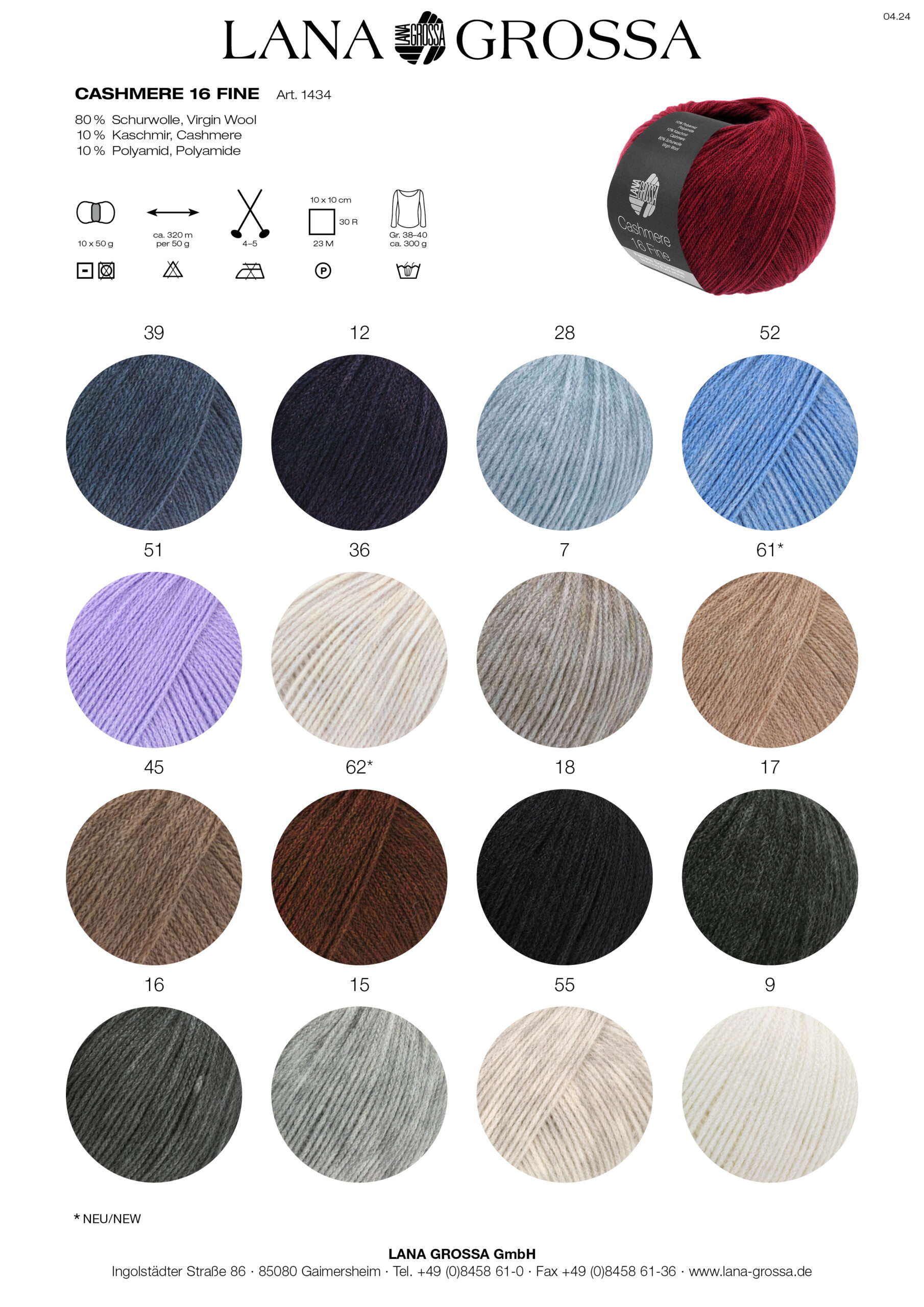 80 % Schurwolle Merino, 10 % Polyamid, 10 % Kaschmir Lauflänge: ca. 320 m / 50 g Nadelstärke: 4 – 5